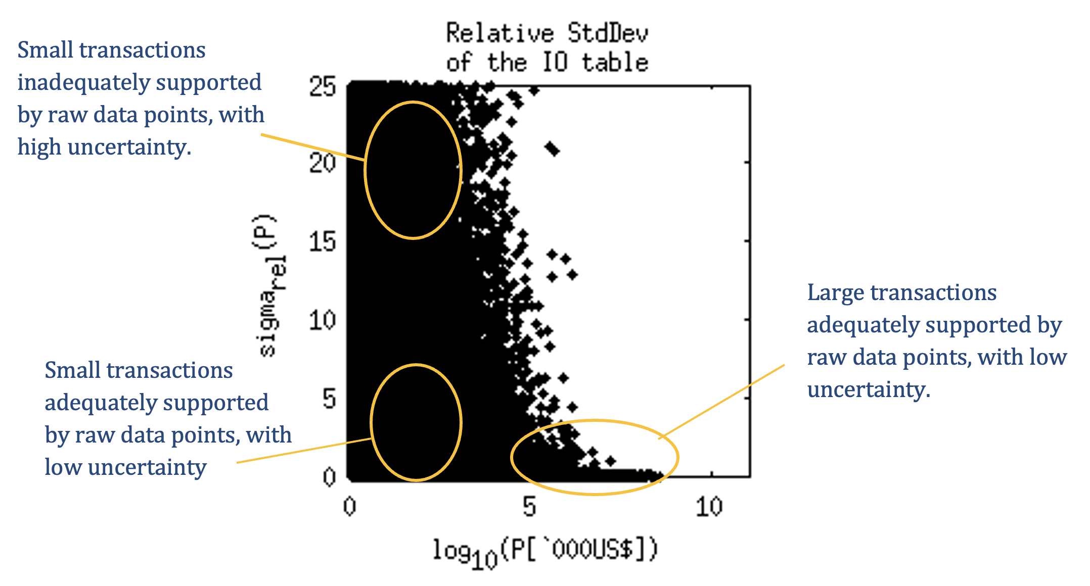 Figure 1 - The larger the value of transactions in the MRIO table (vectorized as P), the smaller the relative standard deviation sigmarel.